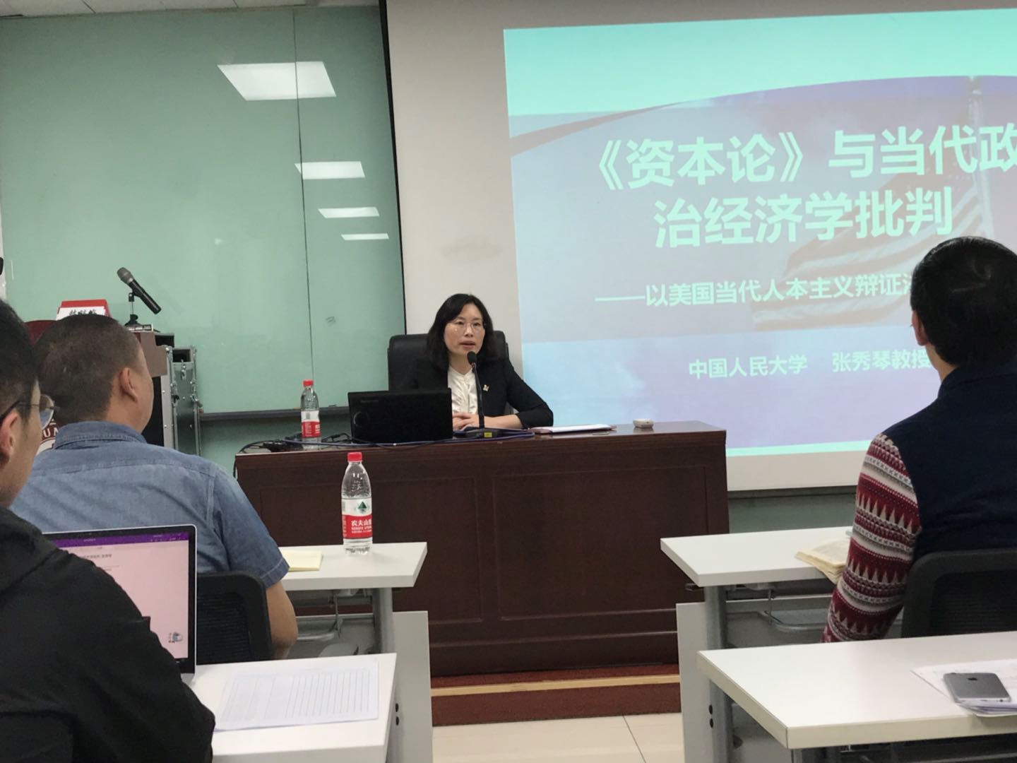 张秀琴教授主讲的题目是“《资本论》与当代政治经济学批判:以美国当代人本主义辩证法学派为例”。她认为,21世纪以来的美国马克思思想研究存在明显的转向,即由过去偏重经验实证分析范式向倚重哲学,特别是辩证法路径的转变。这一点充分体现于他们基于对《资本论》的解读而掀起的对当代政治经济学的批判研究。她将这一时期的美国辩证法学派划分为科学主义和人本主义两大流派。她的主讲内容以波斯顿、奥尔曼、詹姆逊、哈维等人为代表的人本主义辩证法学派为主要研究对象,为同学们提纲挈领地介绍了这些学者的基本观点和对马克思主义辩证法的贡献。她讲授的内容主要分为“辩证法何为:在自然与历史之间”、“政治经济学批判与辩证法:以《资本论》为例的文化研究”两个部分。在第一部分,张老师指出辩证法的发展简史就是一部在自然与历史之间的恩怨纠葛史,从人类思维的二元论化惯性出发,很容易把这一斗争史简化为自然辩证法和历史辩证法之争,然而当代美国辩证法学派,却是一种基于在自然与历史之间的路线的第三条路线,即一方面既不同意“自然辩证法”的传统机械论形而上学,也不同意“历史辩证法”新形而上学神话——特别是经过法兰克福学派的社会批判理论洗礼之后:一方面,当代美国人本主义辩证法学派一般认为辩证法即是历史具体性原则;另一方面,将辩证法认定为历史具体性,其理论基础乃是奥尔曼的内在相关性哲学及其新总体辩证法方法论框架及其背后的传统西方马克思主义奠基。在第二部分中,张老师指出,在当代美国人本主义辩证法学界,辩证法的释义之争很少是纯粹理论觉解,而是一种在论者们看来的政治实践,而这种政治实践又是以文化批判为中介的。于是,关于辩证法的释义这一认识论之争,很快就(必然)蔓延到功能论的层面。基于此,当代美国人本主义辩证法研究学者开始重建马克思主义辩证法的功能,主要内容可归纳为:以政治经济学批判分析为内核的文化研究和以《资本论》探讨为依据的社会批判,并在此基础上试图重建马克思主义辩证法在当代的政治实践旨趣。综上,借助于对辩证法的(在自然与历史之间的)重新释义和(基于《资本论》的文化研究而展开的新政治经济学批判的)功能重建,当代美国人本主义辩证法学者实际上掀起了一场马克思主义辩证法研究史上的范式革命,即从传统唯物辩证法范式转向历史具体的辩证法范式,包括:强调主——客体互动和多元生成关系的主体总体论;以经济——文化有机体论为视角的新的总体化叙事框架等基本内容。此外,张老师还阐释了当代美国马克思主义者与西方马克思主义传统的区别与联系,以及美国马克思主义传播与接受的三个阶段等内容,让我们对由波斯顿、奥尔曼、詹姆逊、哈维等人为代表的人本主义辩证法学派的代表性观点有了系统的把握和了解,并且启发我们要合理吸收、借鉴这些学者的治学方法。