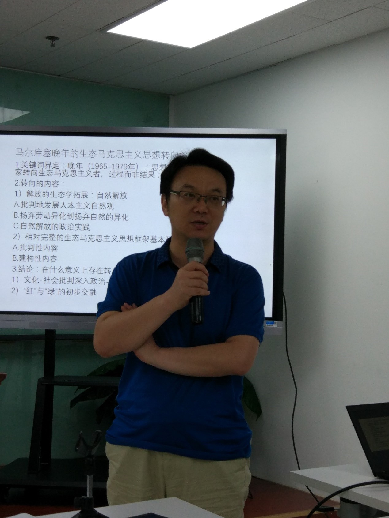 邓佳以“马尔库塞晚年的生态马克思主义思想转向”为题,从转变的过程、转变何以存在、以及研究启示三个方面阐释了她的研究。邓佳将马尔库塞晚年向生态马克思主义转变的过程分为两个方面,一是自然解放,二是比较完整的生态马克思主义思想框架。邓佳认为自然包括两个含义,一是指人的自然存在,人的本能、感受性;二是人存在的自然环境。人是历史唯物主义的基础,要实现人的感受性的解放必须通过自然解放来实现,人和自然的异化和异化的扬弃是相互交融、互为条件的,相互促进的。马尔库塞看到了生态运动对于当时资本主义的反抗特质,结合当时造反运动的实际,提出生态运动从而为解放提出了新的希望。而要实现自然解放,就是要审美解放,它不单单是美学艺术,还有感性学的含义。关于马尔库塞形成的比较完整的生态马克思主义思想框架,邓佳认为包括两个方面,一是批判性的内容,就是对生态危机要追溯到制度根源,就是资本主义制度;二是建构性内容,就是对未来社会的规划或者设想,邓佳将这一设想总结为三个部分,一是解放的主体,即新左派;二是解放的途径,是从激进的革命转向非常温和而持久的大拒斥;三是解放的前景。邓佳认为,马尔库塞晚年在何种意义上存在这种思想转向,应当从两方面来理解,一是马尔库塞晚年作出了一个从文化和社会批判转向政治生态批判的尝试,返回到经典马克思主义本身,寻找社会矛盾运动发展的内在动力;二是在这里存在着红与绿的交融,红就是指马克思主义、绿就是生态问题。
