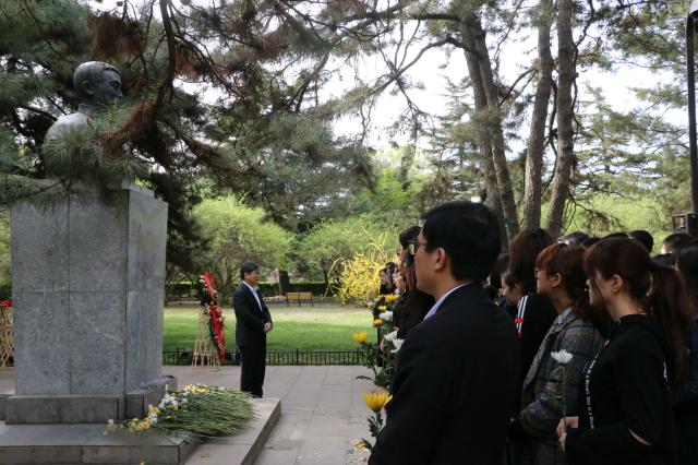四月芳菲,清风拂面,李大钊同志塑像在青松翠柏的掩映下,面庞更显坚毅,参加活动的师生手持黄白菊花,表情庄重,现场气氛庄严肃穆。时至中华人民共和国成立70周年、“五四运动”100周年和李大钊同志诞辰130周年,传承红色基因和学习李大钊精神,具有更加特别的意义。
