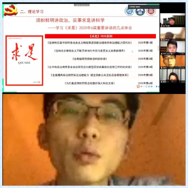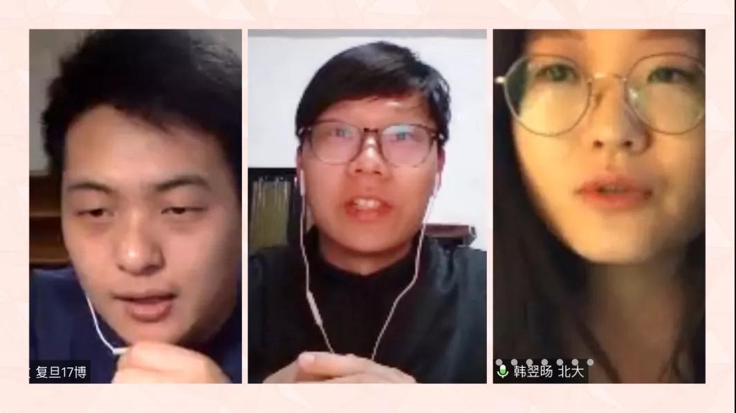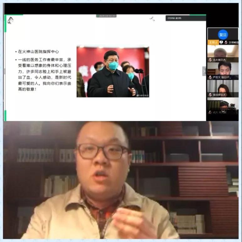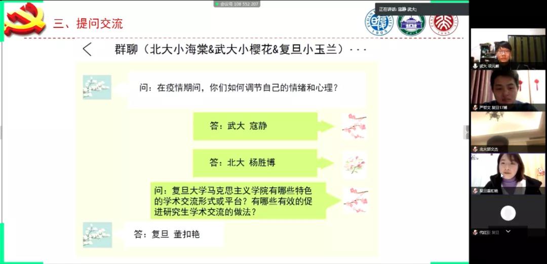 武大马院王翔同学从经济资助、心理辅导、医疗服务和建构信息平台四个方面介绍了公司在疫情期间的贴心举措。复旦马院章慧、石钻佳同学分享了建立毕业论文互助群和求职信息群的成功经验,鼓励大家保持持积极心态,清楚需求不盲从;陆婷婷、许镇峰同学分别解答了论文选题撰写技巧与支部创新性问题。随后,武大马院方蕾同学讲述了自己在黄冈参与防疫志愿工作的经历。北大马院杨胜博、彭逸飞、葛玲玲和杨玉文同学交流了居家学习期间调节心态的体会以及和导师的交流心得,号召同学们坚定信心,科学规划时间,沉下心来阅读经典。武大马院寇静同学鼓励大家加强锻炼、多和家人沟通。复旦马院董扣艳同学介绍了博士生学术工作坊、望道读书会、“小马过河”等公司特色活动,邀请大家一同参与。
