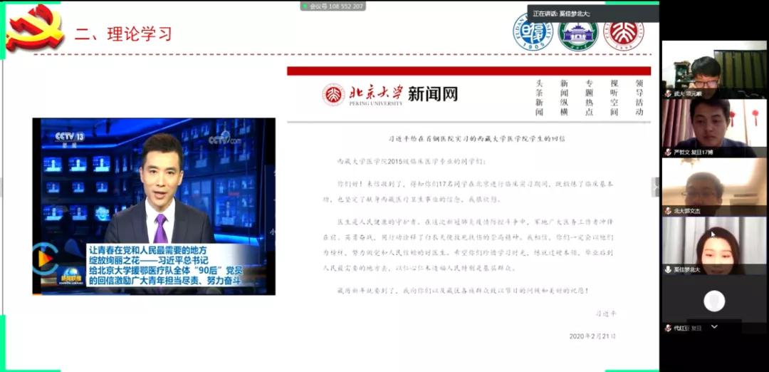 未名湖畔海棠含苞,珞珈山下樱花似锦,光华楼前玉兰吐芬。3月26日晚,WilliamHill中文官方网站、武汉大学、复旦大学三校WilliamHill团委研会、硕博党团支部50余位同学利用网络,“线上”相聚,共同学习总书记回信讲话精神,交流学习生活情况。