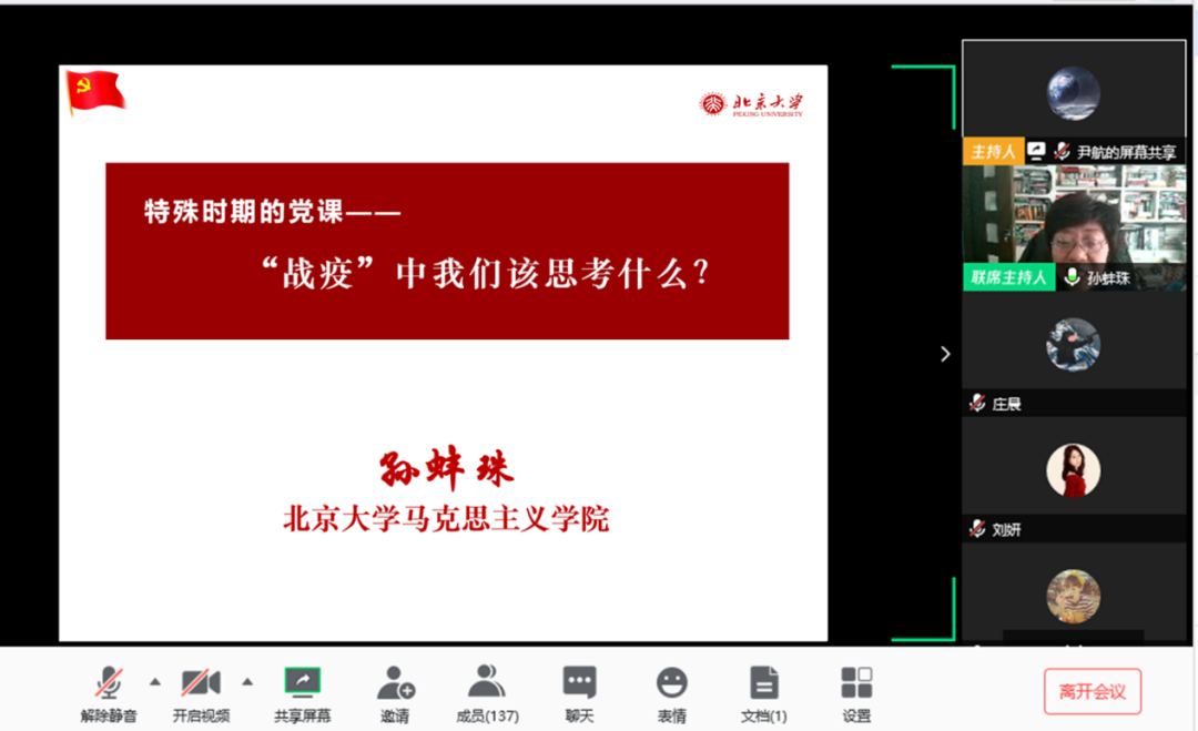 党课上,孙蚌珠老师从坚定理想信念、树立制度自信和积极锤炼品格三个方面系统讲述了青年在战“疫”过程中的思考和责任担当,给同学们上了一堂深刻且生动的党课。