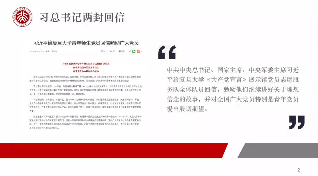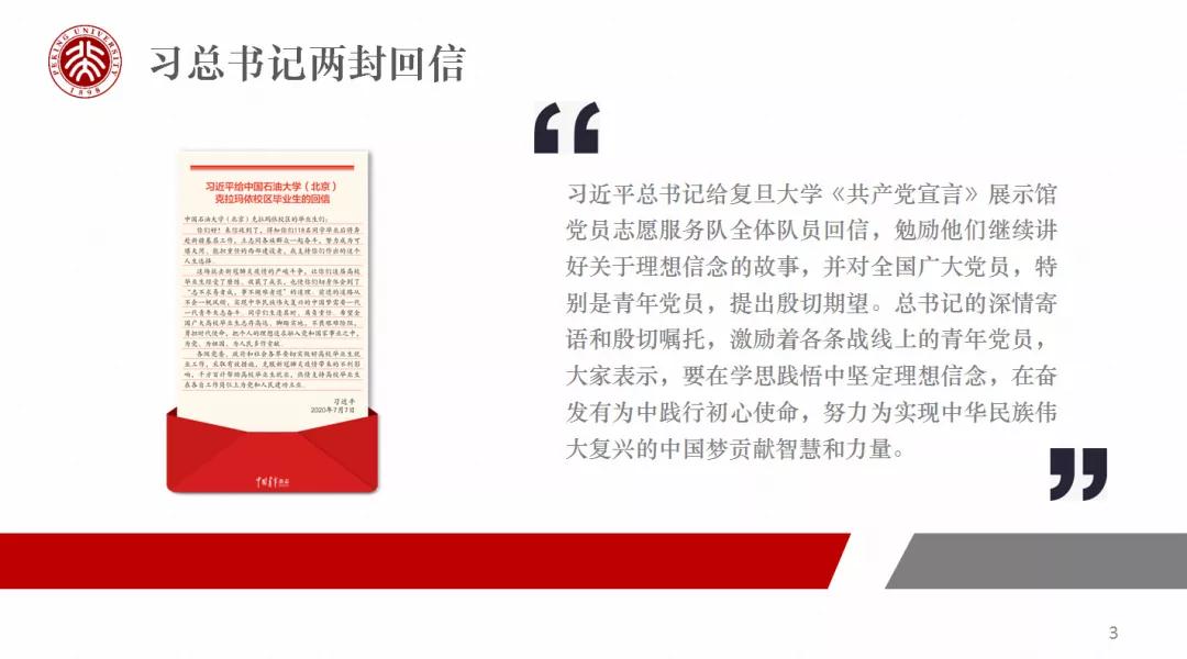 会议首先由钱婷同学朗读了习近平总书记给复旦大学《共产党宣言》展示馆党员志愿服务队以及中国石油大学(北京)克拉玛依校区毕业生的两封回信全文。