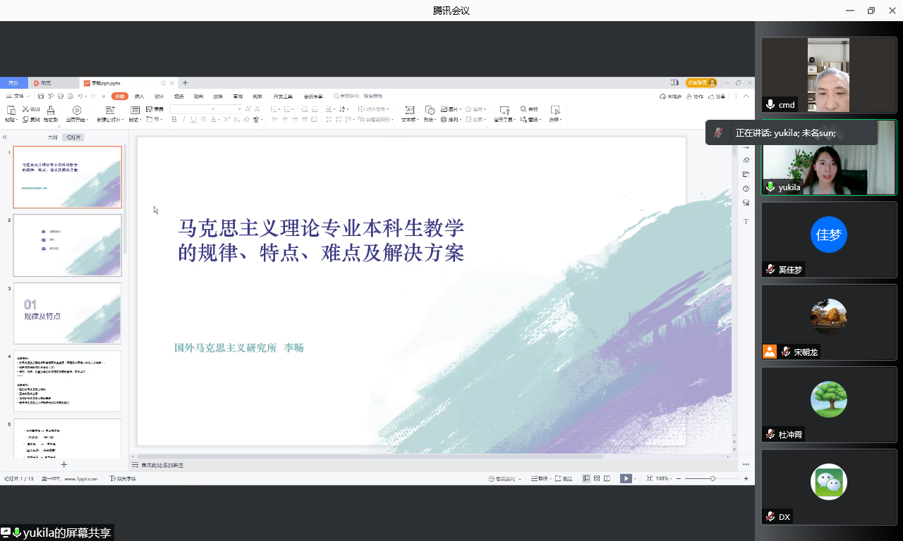 国外马克思主义研究所教师代表李旸老师提出,第一,在总结规律及特点方面,从培养目的和培养目标出发,提出四方面范畴。第二,难点主要是如何兼顾基础知识和学科视野,如何兼顾知识传递与能力培养,如何做好课与课、课程与课程之间的衔接这三方面问题。第三,解决方案主要包括重视课程建设、重视课程体系的设计与打磨、建设课外辅导平台等。