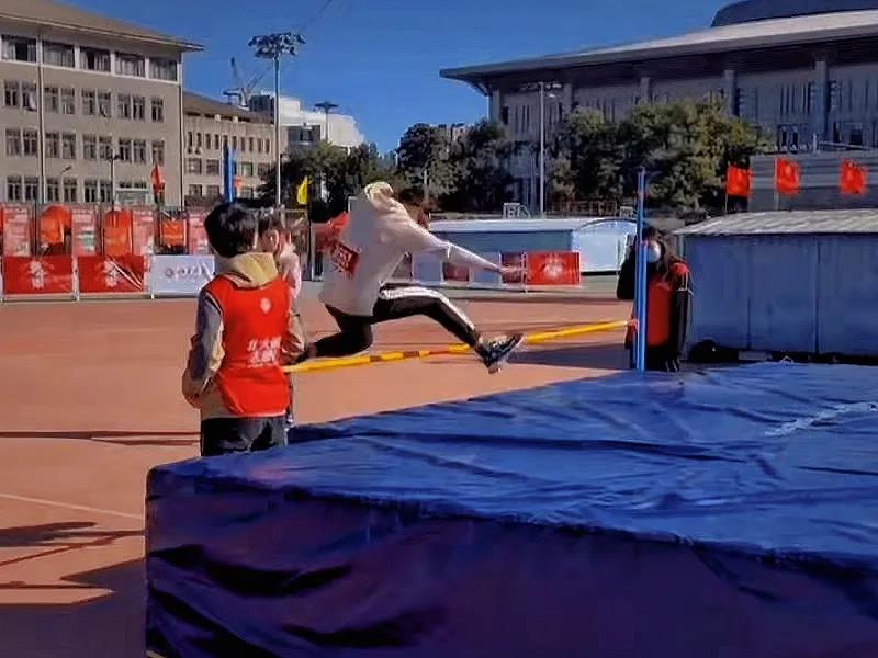 目光移至东南角的跳远赛场:赵欣怡同学在沙坑前一蹬一跃,划过一道优美弧线而后轻盈落地。她在女子立定跳远中以绝对的优势勇夺冠军,为我们本科新生取得开门红!