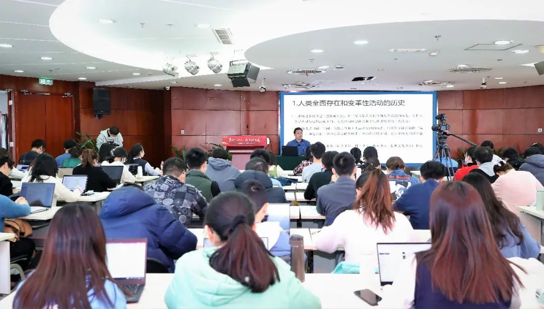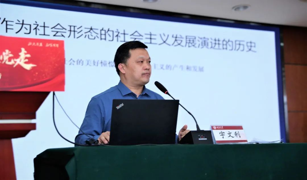 宇文利以社会主义发展史为轴,全景式地为同学们描绘了从空想社会主义的产生到科学社会主义的创立与实践再到中国特色社会主义的开创与发展的壮阔图景。他指出,马克思、恩格斯提出的“新时代”这一概念,是指科技进步推动生产力大解放大发展、革命性的新的生产关系出现、最终实现了人的解放和每个人自由全面发展的美好社会。他谈到,要准确把握我国发展的新的历史方位,深刻认识到我们依然处在马克思主义所指明的历史时代。马克思、恩格斯关于资本主义必然消亡、社会主义必然胜利的重要论断,正确反映了世界历史发展不可逆转的总趋势,要坚持事物发展前进性和曲折性的统一。