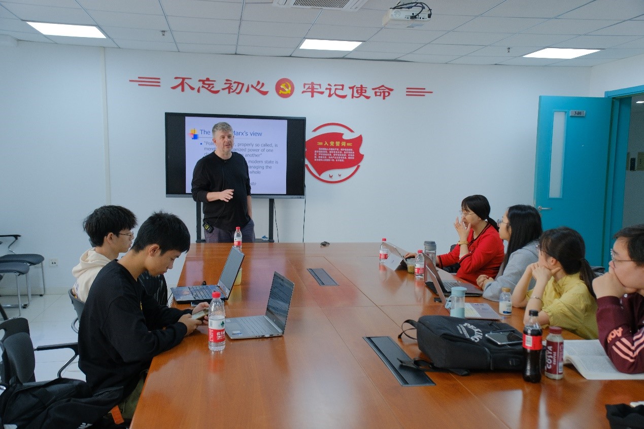 10月11日下午,保罗·布莱克里奇教授以“马克思的国家理论”(Marx’s Theory of the State)为题,讲授第四次课程。教授认为,马克思从两个方面界定了国家:国家权力是统治阶级权力的集中表现,同时国家具有一定程度的相对自主性。他比较了马克思和黑格尔在《法哲学原理》中的观点,指出黑格尔将市民社会和现代国家自然化,而马克思则认为它们都是历史地形成的。由此,教授分析了不同的国家形式,考察了从奴隶制社会到资本主义社会的历史变革过程。其次,教授具体讲述了资本主义国家的结构和职能。他强调,在现代社会,国家和资本之间相互依存,政治与经济交织在一起。国家在一定程度上推动了文明的进步,但国家也是资产阶级事务的代理人,资本需要国家执行司法、警察职能,保障资本的自由积累,调和阶级矛盾。之后,教授重申了马克思主义对未来国家的设想,即打碎资产阶级国家机器,实现无产阶级专政,促使国家最终转变为自由人的联合体。在课程末尾,教授还结合英国帝国主义的扩张历史、黑格尔与马克思国家理论的区别等话题,与师生进行了深入讨论。