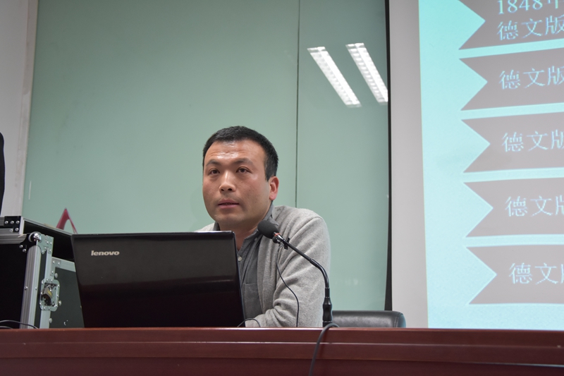 李爱军博士后以《<共产党宣言>在中国传播的版本厘清及其对思想内容的深化》为题,按“《宣言》发表后各种译本相继问世”、“《宣言》在中国传播的版本厘清”和“对《宣言》思想内容认识的深化”三个问题依次展开其讲课内容。他首先梳理了《宣言》发表后国内外的各种版本。国外版本有德文版、英文版、俄文版、意大利文版、波兰文版等100多种文字。国内版本,他梳理了学界关于《宣言》译本的几种说法。他指出,以新中国成立为界,建国前《宣言》有九版本说、七版本说、六版本说;建国后《宣言》有八版本说等。在学界研究成果的基础上,李老师重点梳理了中央编译局译校、人民出版社出版发行的《宣言》版本流传的情况。在讲到第三个问题时,他指出,应该继承《宣言》中所蕴含的重要思想方法论:对马克思主义基本原理的运用必须随时随地以当时的历史条件为转移,因此,今天对《宣言》的认识应该从改革开放前阶级斗争的认识视域转向当下中国特色社会主义新的实践,充分挖掘《宣言》的其他思想内涵,比如发展民主、全球化、每一个人的发展是一切人的自由发展的条件等,从中吸取思想资源。讲座的最后,李老师还谈到考证经典文献的版本流传的意义。在他看来,读经典时,需要把经典的思想创作史与版本流传史结合起来,不能只读到一个横向的、静态的文本,而要读出一个纵向的、动态的文本,读出文本的历史性。